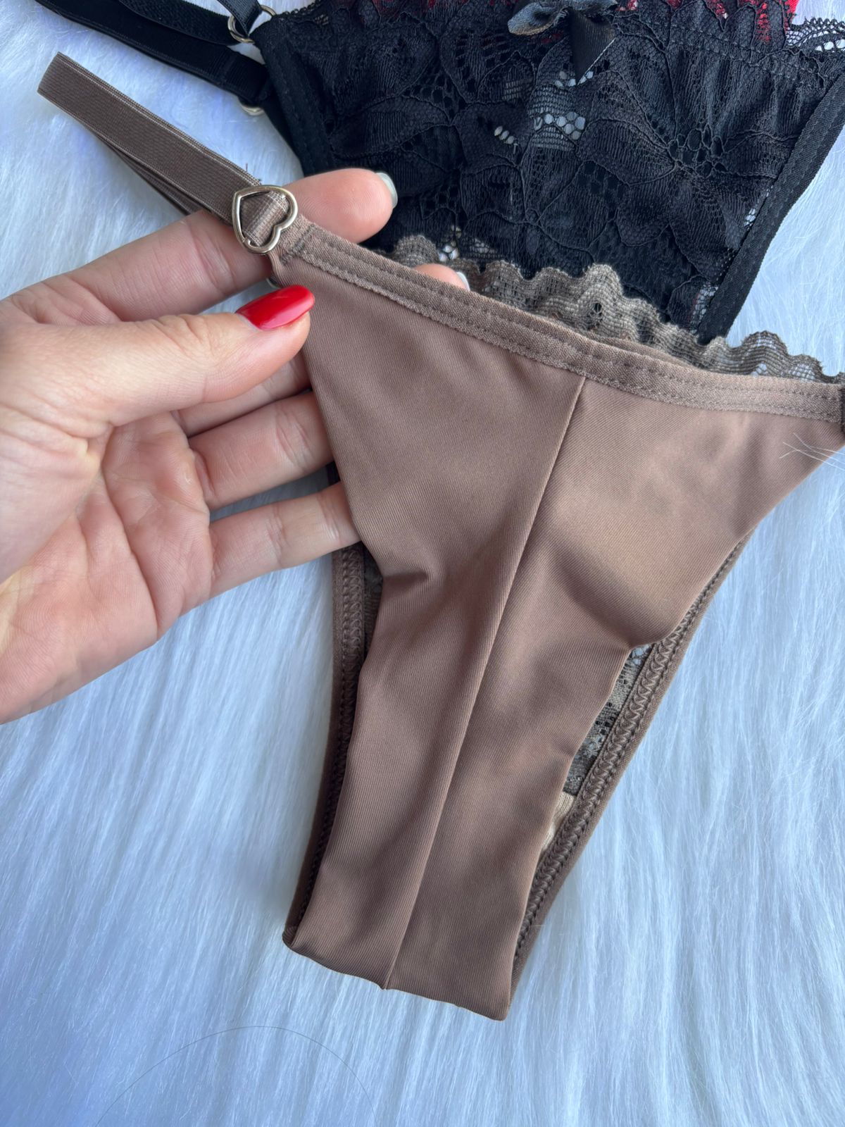 A parte de trás em tecido de poliamida, modelo fio duplo, que proporciona conforto no uso diário, sem abrir mão da sensualidade.